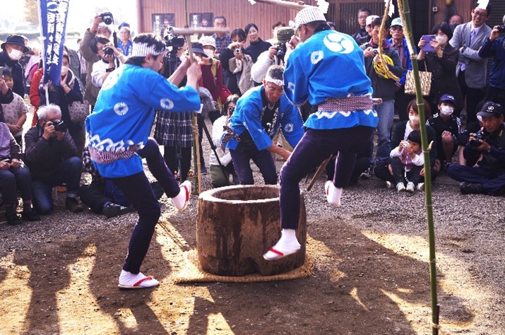しかし、同様の状況においても、中断していた祭礼・行事が再開する事例があります。たとえば、県内では、東松山市金谷の餅つき踊りや野田の獅子舞が中断から再開をしています。県外では、秋田県男鹿市のナマハゲ行事、神奈川県伊勢原市の高部屋神社の潮汲み神事なども、近年再開した祭礼・行事です。今回の講座では、なぜ一度中断した祭礼・行事が再開できたのかに特に注目しながら、写真や映像を交えて、祭礼・行事の現在についてお話をいただきます。(図は《東松山市金谷の餅つき踊り》) |